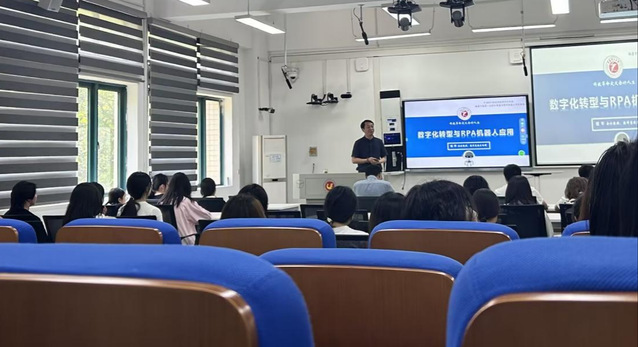 本网讯(记者王天锦)5月9日下午于教2-207,一场关于数字化转型与RPA机器人应用的讲座在ok138cn太阳集团529成功举办。本次讲座邀请了业内知名专家重庆理工大学程平教授主讲,ok138cn太阳集团529财务管理系主任贺琛主持、副院长曾义出席讲座,为学生们带来了一场关于数字化时代和机器人流程自动化的知识盛宴,旨在提升学生们对数字化转型的认知,激发他们对RPA机器人应用的研究兴趣。