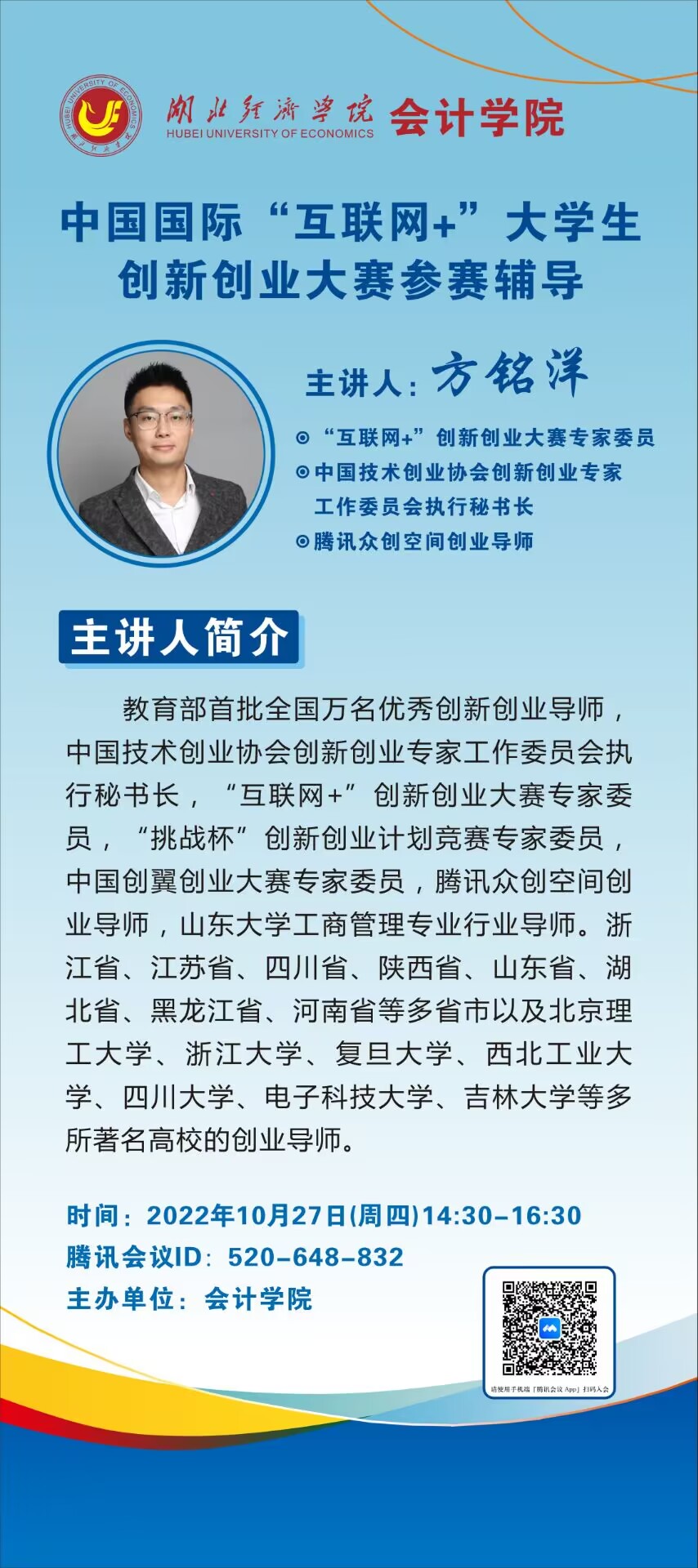 2022年10月27日下午,由ok138cn太阳集团529主办的“中国国际‘互联网+’大学生创新创业大赛参赛辅导”会议召开,本次辅导会由教育部首批全国万名优秀创新创业导师、“互联网+”创新创业大赛专家委员会,“挑战杯”创新创业计划竞赛专家委员方铭洋主讲,广大师生以腾讯会议的形式参加此次会议。
