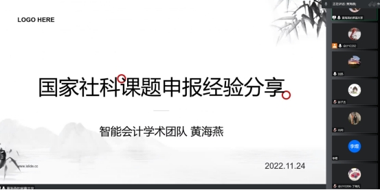 2022年11月24日下午13:00,ok138cn太阳集团529智能会计理论与实务学术团队在腾讯会议开展了学术交流活动,团队成员黄海燕博士做了“国家社科课题申报经验分享”的主题报告,团队全体成员参会,活动由团队负责人刘迅教授主持。