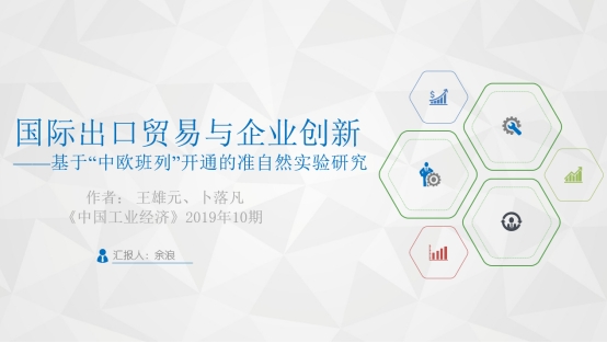 余浪博士报告了论文《国际出口贸易与企业创新——基于“中欧班列”开通的准自然实验研究》,首先对论文研究的主题、逻辑思路、实证方法等进行了汇报,随后大家对论文展开了深入的讨论,并交流了未来可以扩展的研究话题,为后期研究开拓了思路,现场科研氛围浓厚。