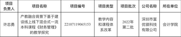 本网讯 近日,教育部高等教育司公布2022年第二批产学合作协同育人项目立项名单,我院许志勇副教授“产教融合背景下基于建设线上线下混合式一流本科课程《财务管理》的教学探究”项目获批立项。