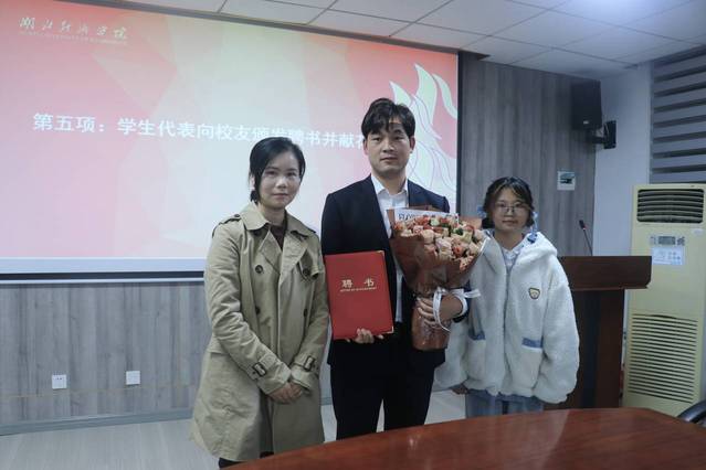 会计2442班为校友王旭升颁发了学校发放的荣誉班主任聘书,并献花。