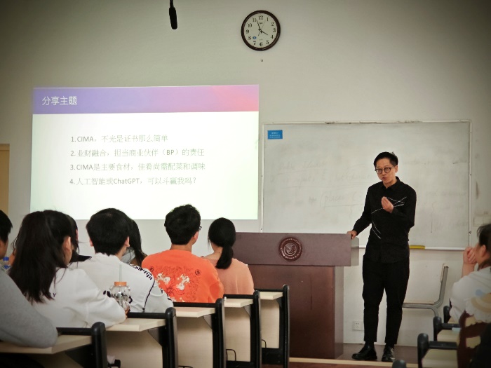 在讲座中,张汉云老师首先向同学们分享了自己80年代初在香港理工大学读CIMA班的经历和自己的职业发展路径;其次,从商业社会的主要现金流向这一视角跟同学们一起探讨了学习财务者的不同以及CIMA班学生的主要就业和职业发展路径;然后,以实际案例向同学们解释了“业财融合”的意义和管理会计人员的工作方式;之后,张汉云老师通过自己三十余年的工作中所遇到的科技变革回答了同学们关于人工智能或Chat GPT对财会人员是否会有冲击这一话题;最后,这位资深CIMA学长向年轻的学弟学妹们提出期望,希望同学们把握青春大好时光,不要忧心未来,而是要开心踏实的走稳目前的每一步。