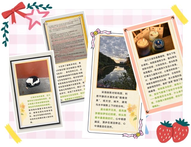 在“美·定格瞬间”板块,同学们通过照片与短视频记录生活中的小确幸:一片秋叶、一盏街灯、一次手作,配上真挚的文字,平凡日常被赋予温柔注视;“习·奔向美好”则涵盖读书摘抄、单词背诵、技能练习、笔记整理等内容,大家在分享中彼此激励,夯实专业所学,也传递实用的心理知识;“体·拥抱健康”鼓励同学们规律运动、早睡早起、正念冥想、均衡饮食,用切实行动关爱身心,塑造积极节奏。