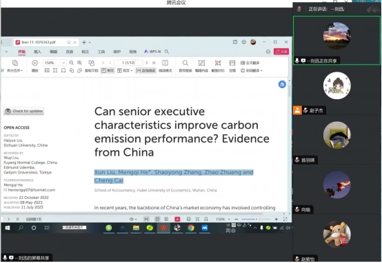 会上,团队负责人刘迅教授分享了他最新研究成果“Can senior executive characteristics improve carbon emission performance? Evidence from China”。刘教授重点分享了他写作过程中对企业高管和碳高排放量企业的样本选择,对建立多元线性回归方程模型的变量和考虑因素,以及对所选样本的统计分析与研究,同时还分享了论文写作、投稿及多轮修改的心得。与会的老师和同学进行了热烈的讨论,气氛活跃。