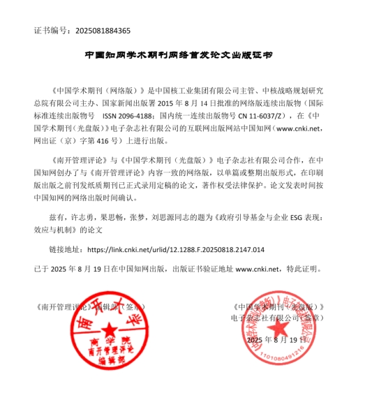 中心主任许志勇教授的论文《政府引导基金与企业ESG表现:效应与机制》2025年8月19日在《南开管理评论》网络首发。